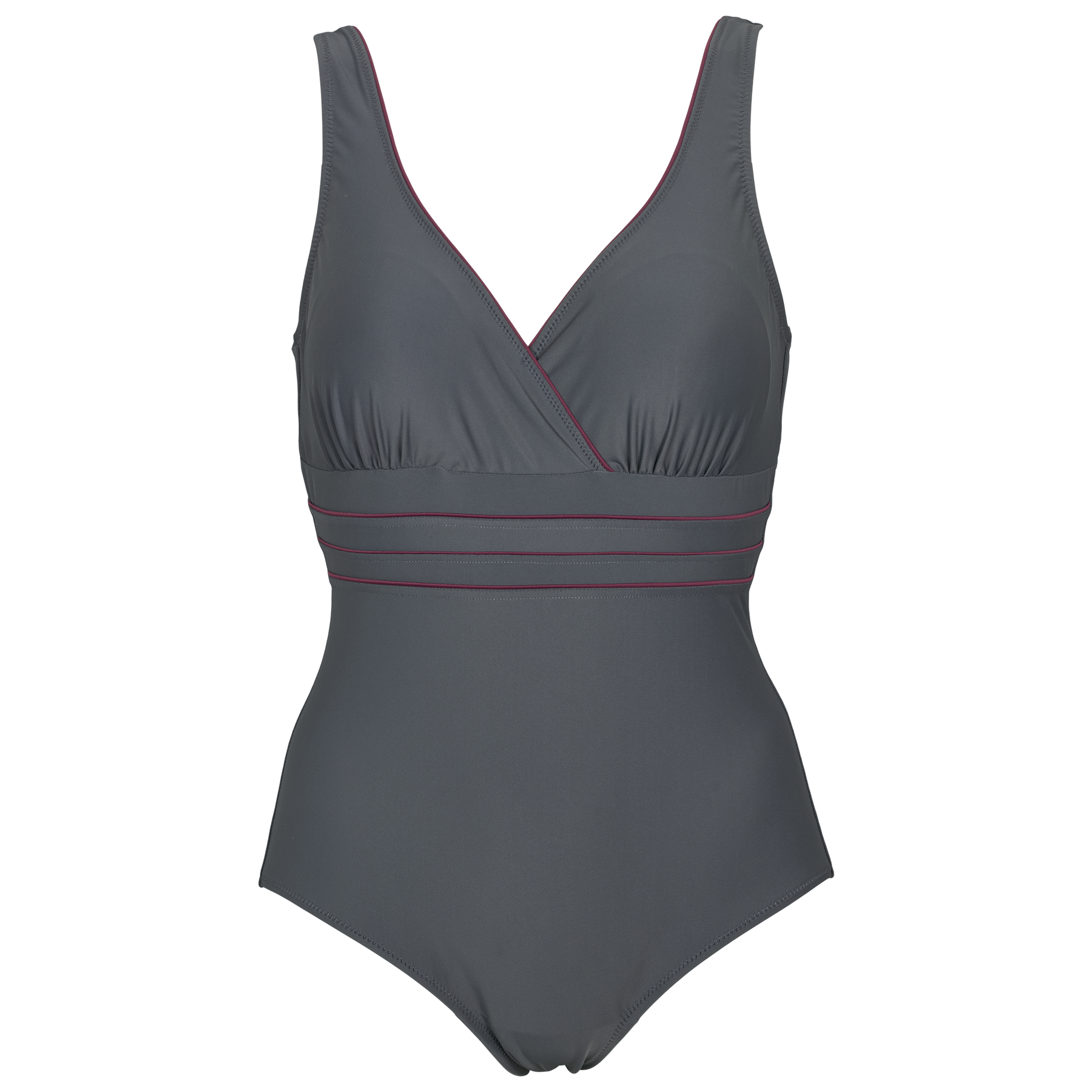 Grå Samos badedragt med fine detaljer. Badedragten har en flatterende dyb rygudskæring og smukke kontraststriber foran, samt langs kanten af brystet.